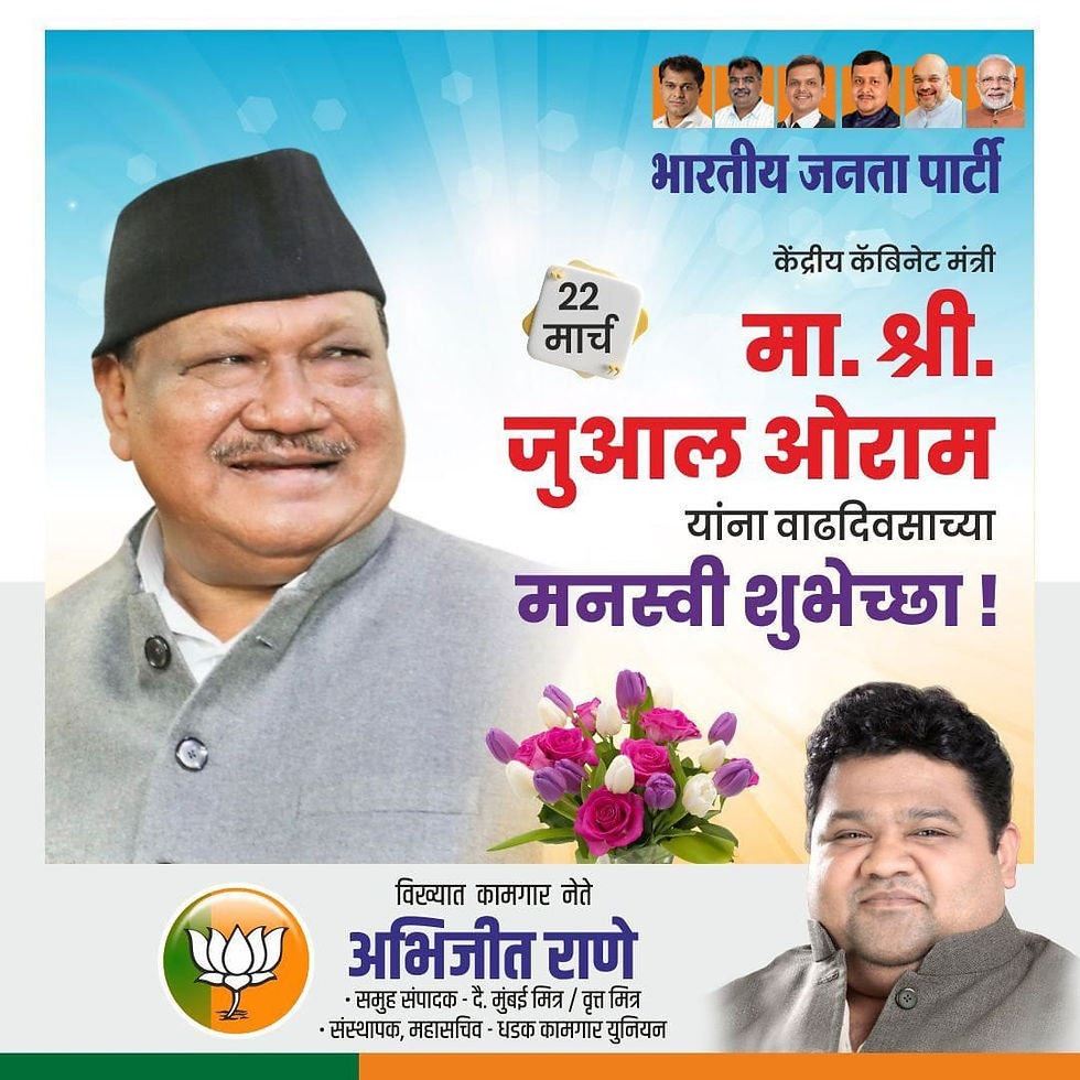 केंद्रीय कॅबिनेट मंत्री श्री जुआल ओराम जी यांना वाढदिवसाच्या हार्दिक शुभेच्छा. 💐 -अभिजीत राणे मुंबई अध्यक्ष, भाजपा कामगार आघाडी संस्थापक महासचिव- धड़क कामगार यूनियन #JualOram #mp #birthday #BJP4IND #a