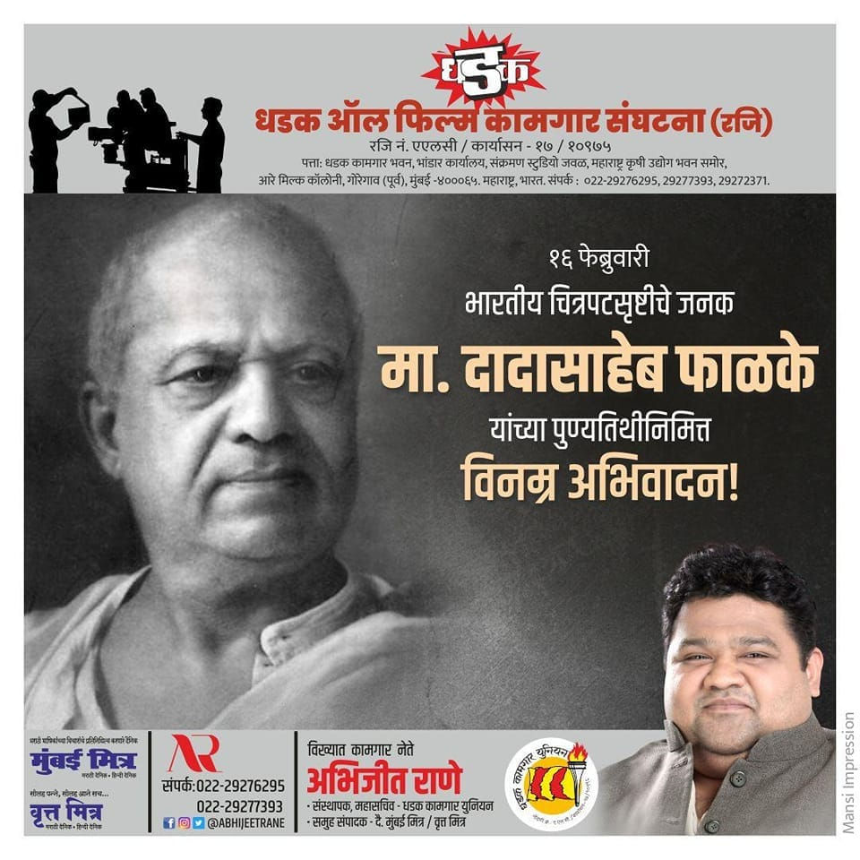 पहिला मराठी चित्रपट तयार करून, भारताला मनोरंजनविश्वाचे दालन खुले करून देणारे, भारतीय चित्रपटसृष्टीचे जनक दादासाहेब फाळके यांना स्मृतिदिनी विनम्र अभिवादन.. -अभिजीत राणे संस्थापक, महासचिव - धडक कामगार य