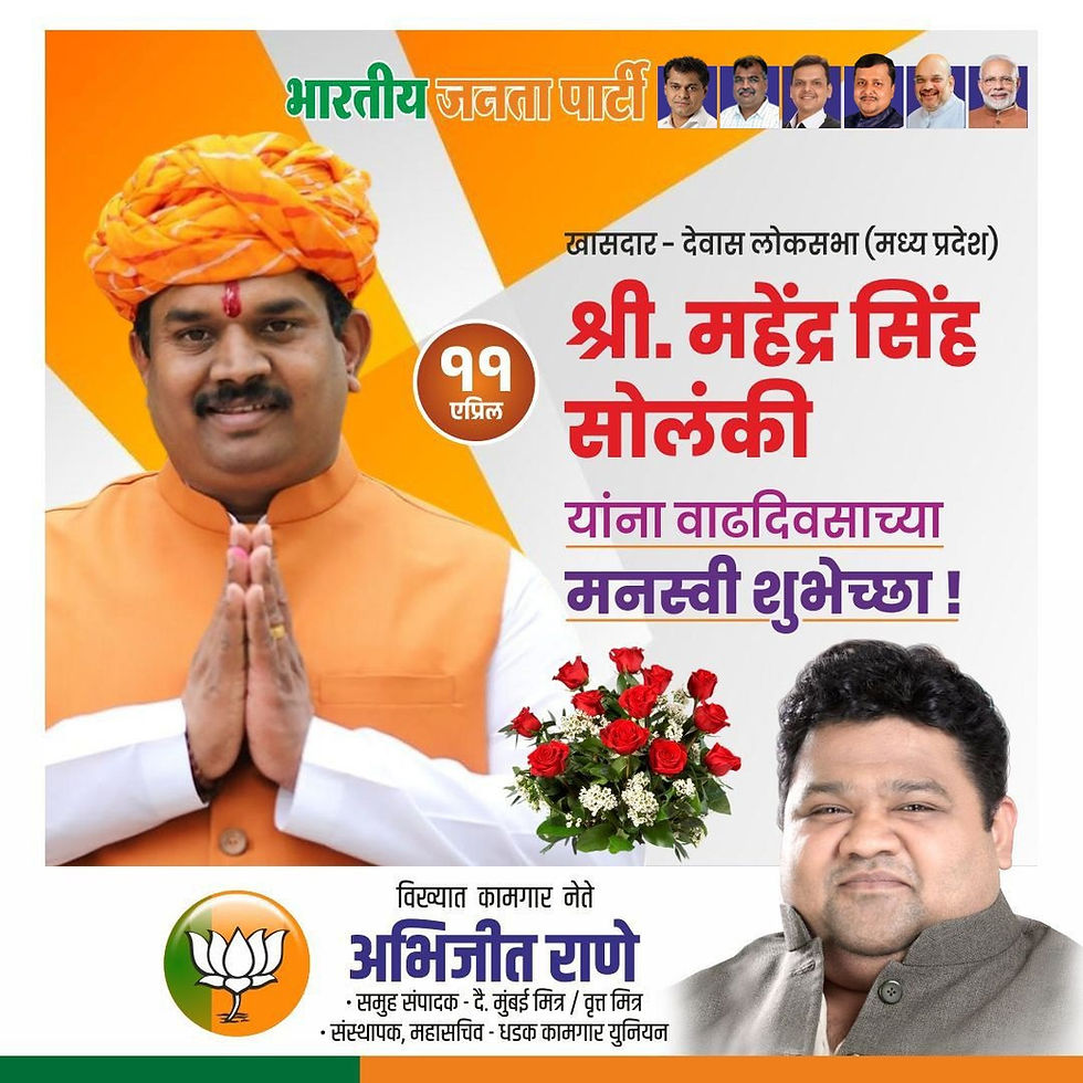 मध्य प्रदेशातील देवास येथील लोकसभा खासदार श्री महेंद्र सिंह सोलंकी यांना वाढदिवसाच्या हार्दिक शुभेच्छा. -अभिजीत राणे मुंबई अध्यक्ष, भाजपा कामगार आघाडी संस्थापक महासचिव- धड़क कामगार यूनियन #MahendraSing