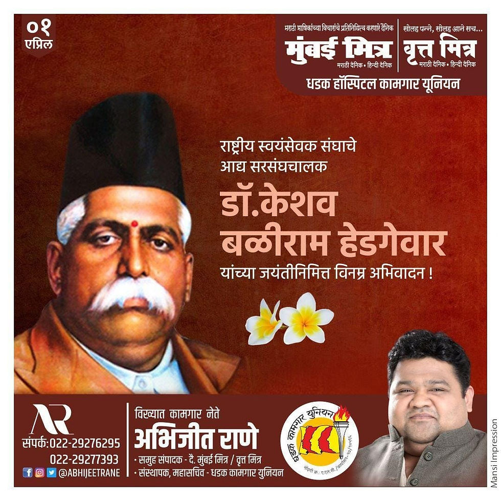 राष्ट्रीय स्वयंसेवक संघाचे आद्य सरसंघचालक प.पू. डॉ. केशव बळीराम हेडगेवार यांना जयंतीदिनी शत शत नमन ! -अभिजीत राणे मुंबई अध्यक्ष, भाजपा कामगार आघाडी संस्थापक महासचिव- धड़क कामगार यूनियन #KeshavHedgevar
