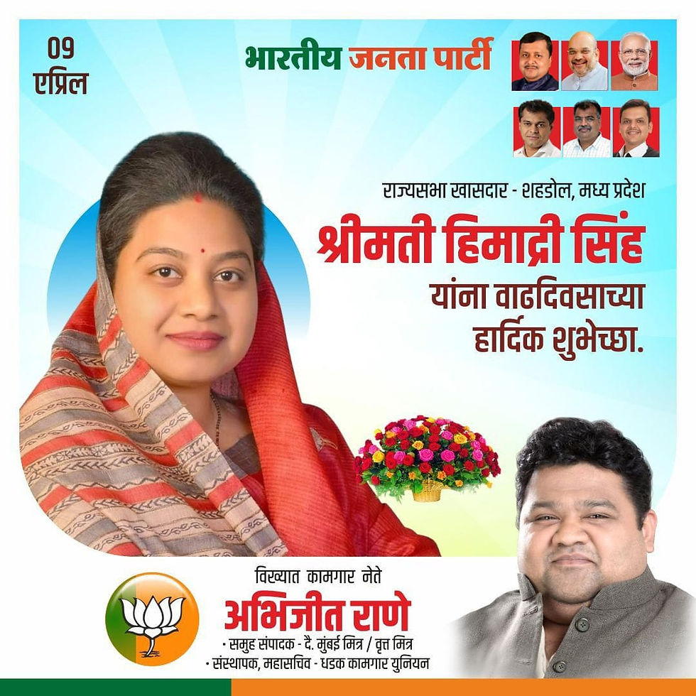 शहडोल, मध्य प्रदेशचे लोकसभा खासदार श्रीमती हिमाद्री सिंह जी यांना वाढदिवसाच्या हार्दिक शुभेच्छा. -अभिजीत राणे मुंबई अध्यक्ष, भाजपा कामगार आघाडी संस्थापक महासचिव- धड़क कामगार यूनियन #HimadriSingh #bjp #